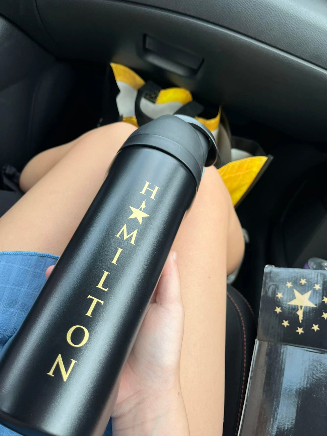 "This bottle is literally perfect! The matte black with gold letters hits different and I get compliments every single day. Finally found something that matches my Hamilton obsession AND keeps my water ice cold. No regrets!"