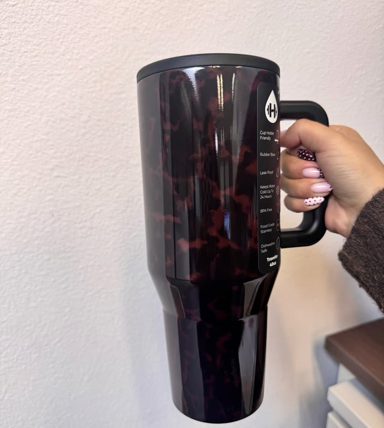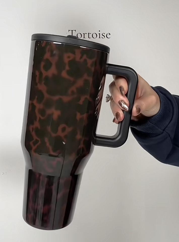 "Switched from Stanley and not going back. This one actually fits comfortably and the tortoise print>>>. 🤎"
